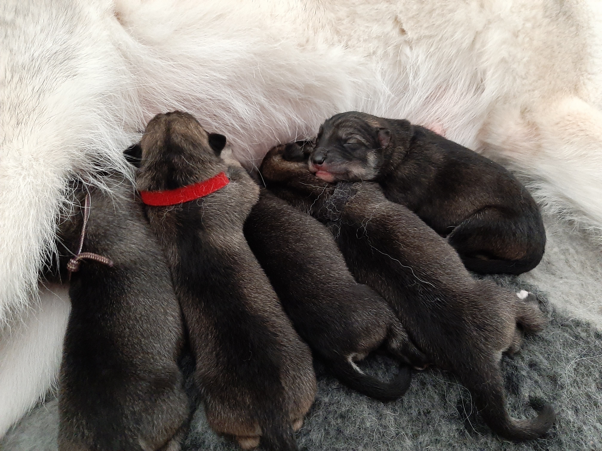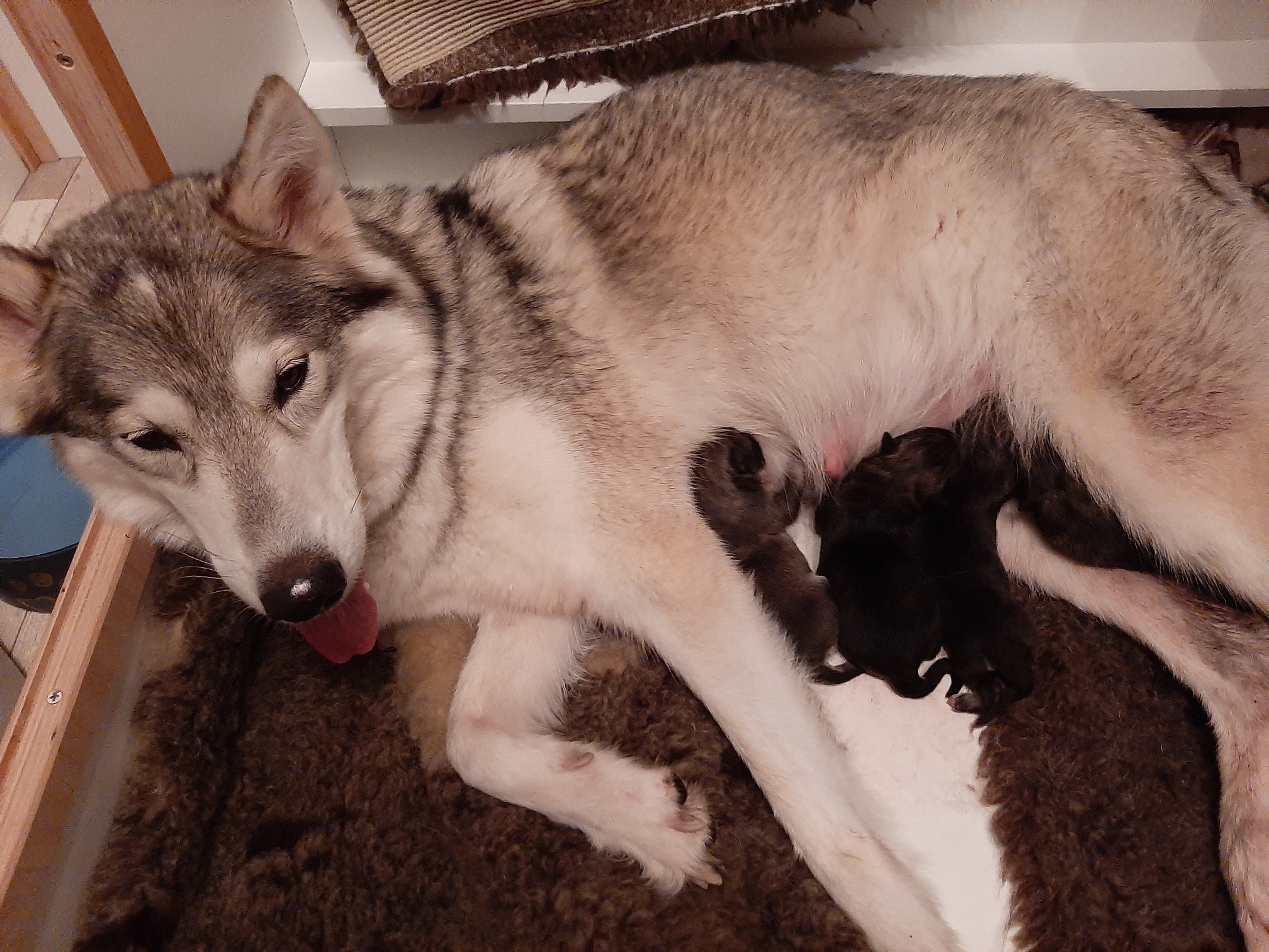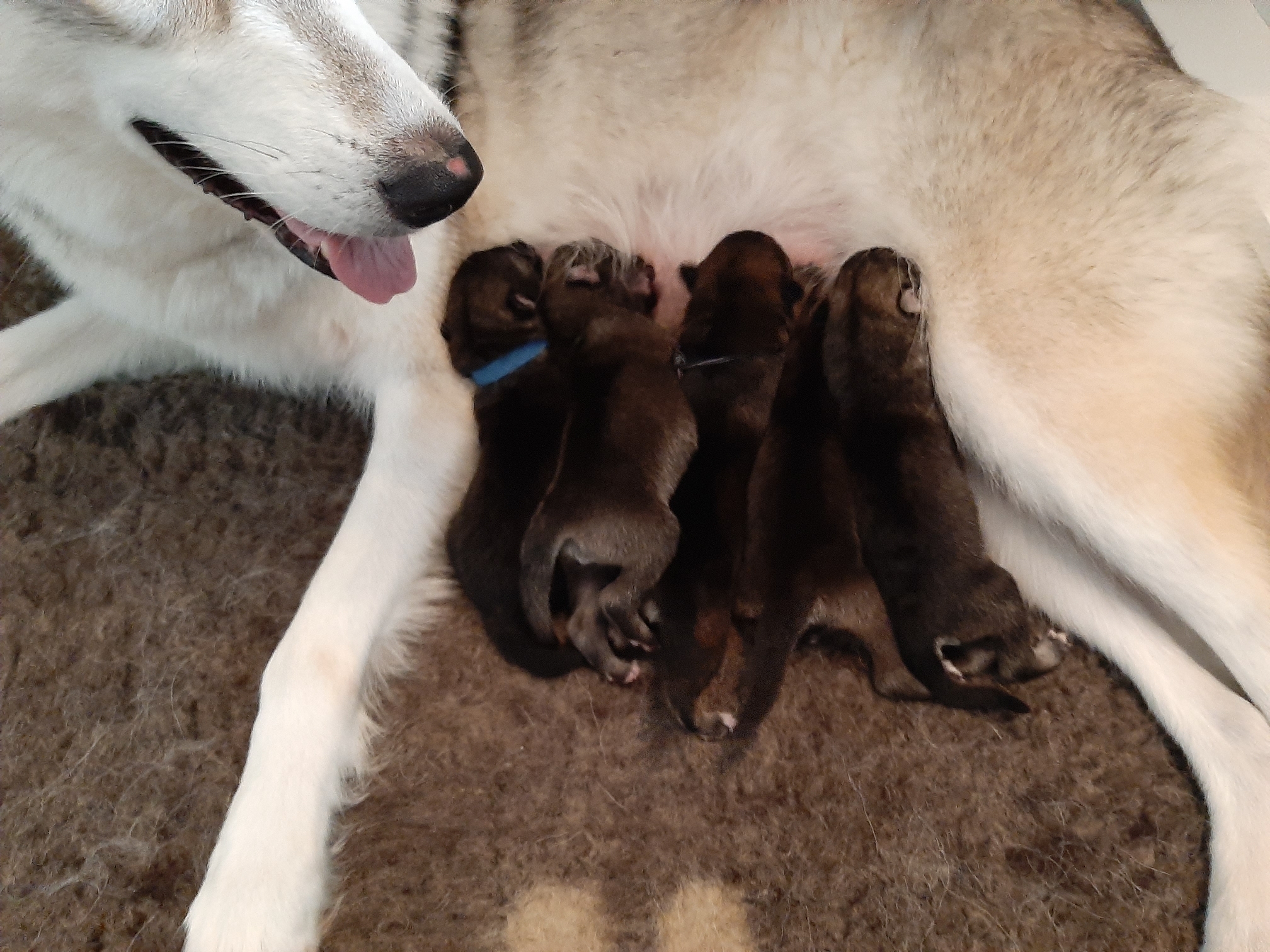 An Tag 63 bringt Lyca 6 kleine Wölfchen zur Welt. Die Geburt verlief recht zügig und Gott sei Danke ohne Komplikationen. Wir freuen uns jetzt auf eine schöne Welpenzeit.